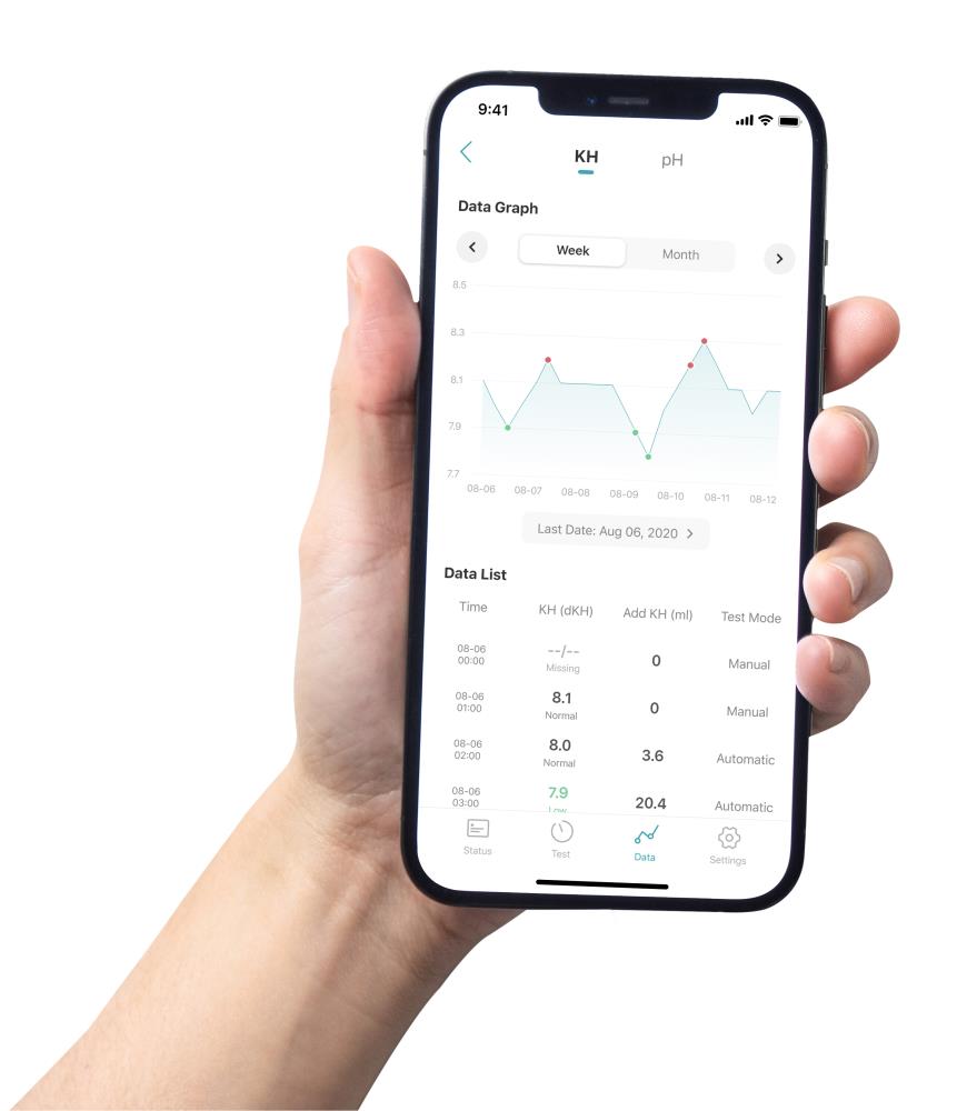 Nach jedem Test wird das Ergebnis auf dem Gerätedisplay angezeigt, um eine schnelle Übersicht zu erhalten, zusammen mit der Uhrzeit und dem Datum, an dem der Test durchgeführt wurde. In der App wird ein vollständiges Datenprotokoll sowohl für den pH- als auch für den KH-Wert angezeigt, zusammen mit der automatischen Zugabe von KH-Pufferlösung, wenn die Dosierungsoption aktiviert ist.