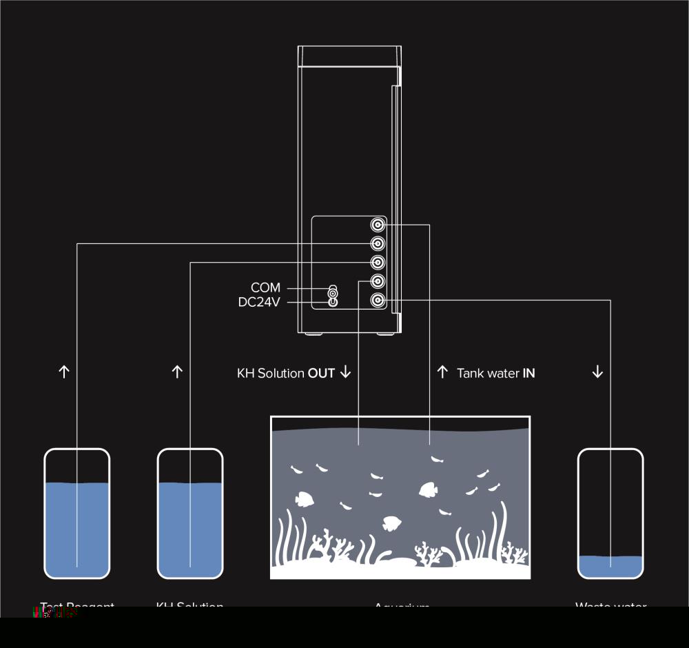 Die automatische KH-Wartung kann aktiviert werden, um ein stabiles und gleichbleibendes Niveau zu erhalten. Sobald der Test durchgeführt wurde, wird ein spezieller, eingebauter Dosierkanal aktiviert, um einen flüssigen Puffer hinzuzufügen, der den KH-Wert im Aquarium auf den vom Benutzer festgelegten Sollwert anhebt.