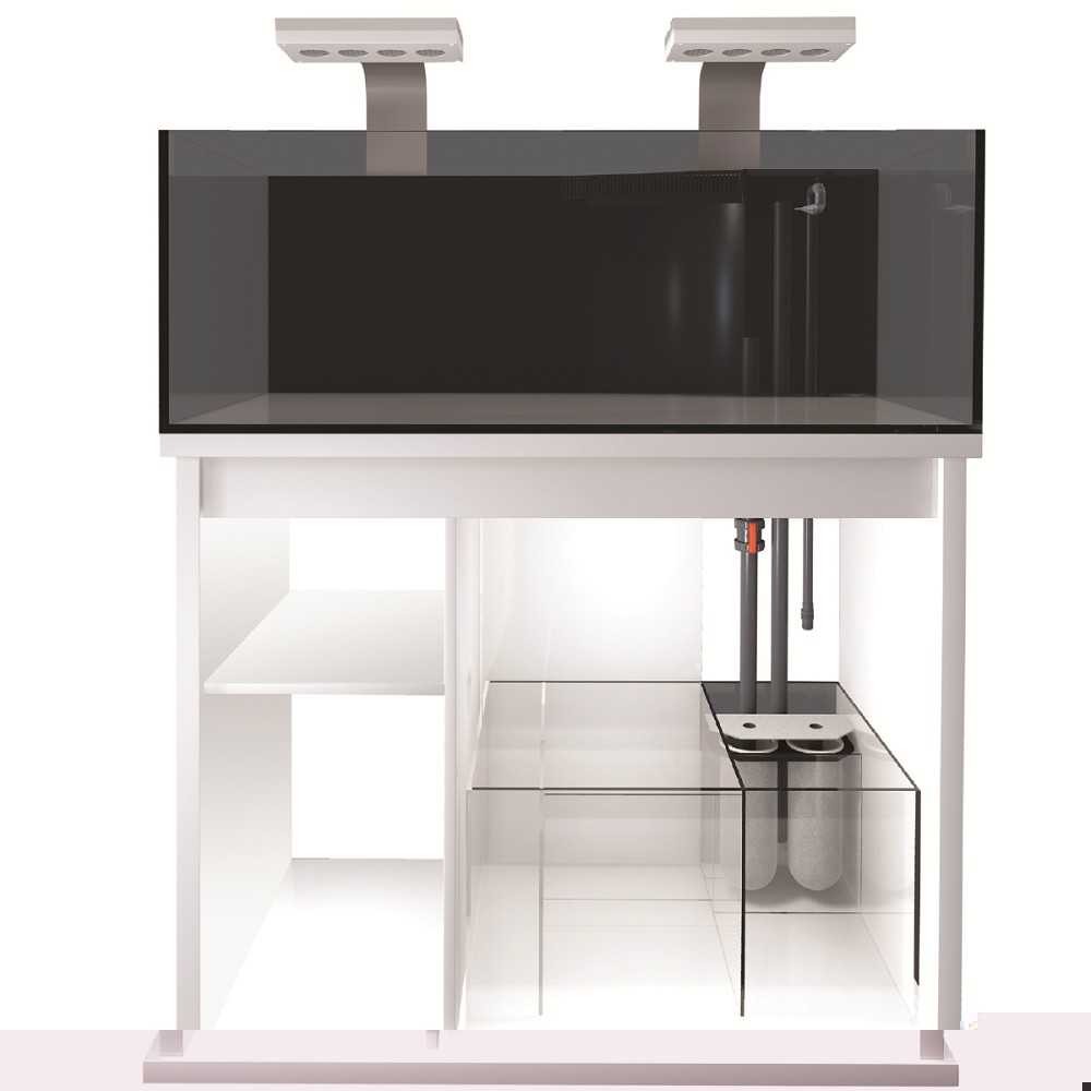 Kristallklares, rahmenloses Weißglasbecken mit vollständig polierten Kanten für einen ungetrübten Blick auf Ihr Riff. Ausgewogenes Verhältnis von Breite zu Höhe, um die Sicht und die Gestaltung eines natürlichen Riffs zu erleichtern. Einzigartiger Überlaufschacht aus laminiertem, schwarzem Glas, welcher an der Rückseite des Aquariums quasi unsichtbar ist.