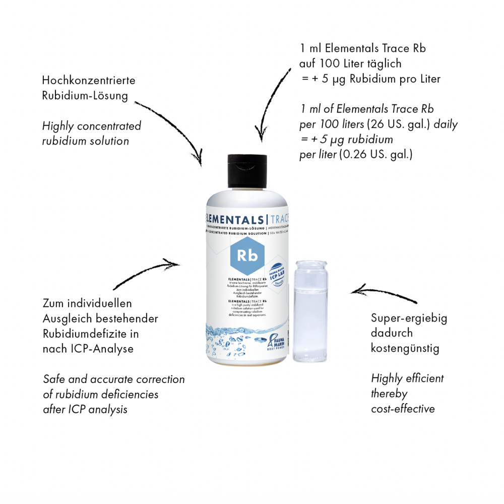 - 1 ml Elementals | Trace Rb in 100 l Aquarienwasser erhöht den Rubidiumgehalt um 5 µg/l.