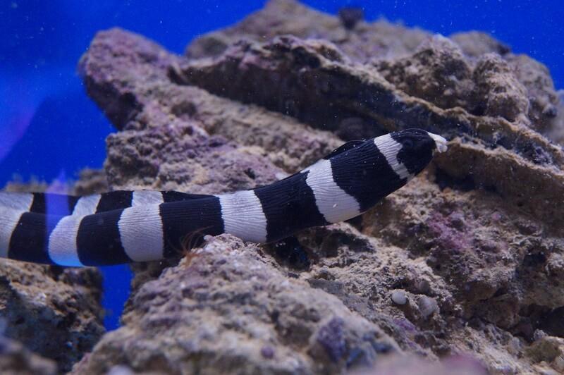 Mal etwas anderes wie nur "Fisch":Der Schlangenaal Myrichthys colubrinus imitiert durch seine Zeichnung eine giftige Seeschlange, ist aber total harmlos und ein absoluter Hingucker.